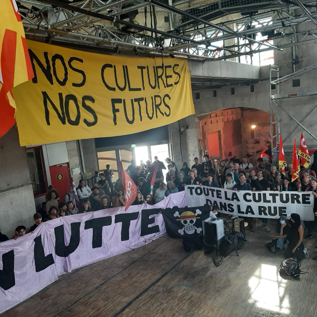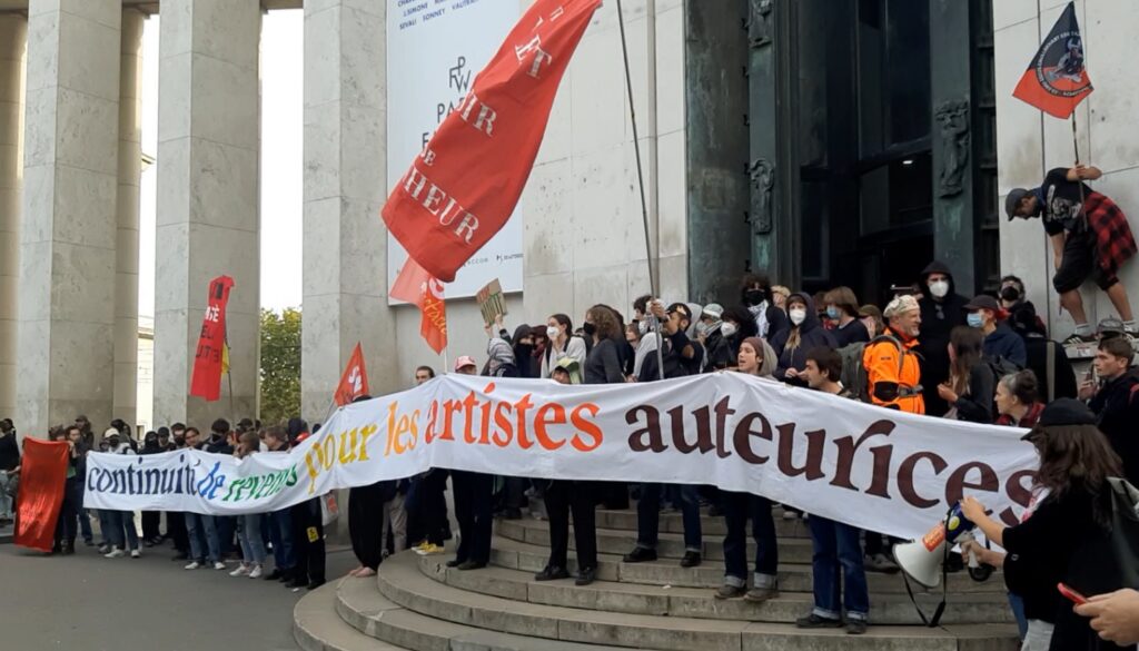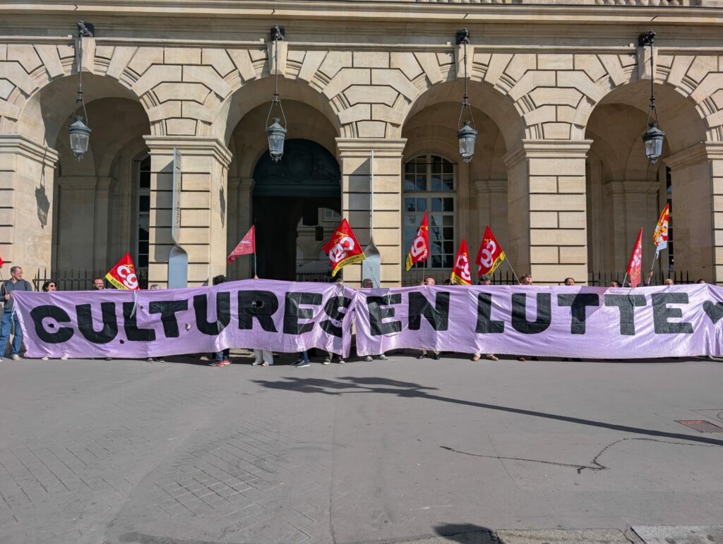 Au même moment, la CGT-Culture, la CGT-Spectacle et des collectifs de travailleuses et travailleurs des arts et de la culture déployaient la banderole Cultures en lutte à l’Hôtel de la Marine face à l’Assemblée nationale et près de 200 précaires des arts et de la culture occupaient le Palais de Tokyo avant d’être évacué.e.s par la police et les CRS, toujours sur ordre de la ministre…