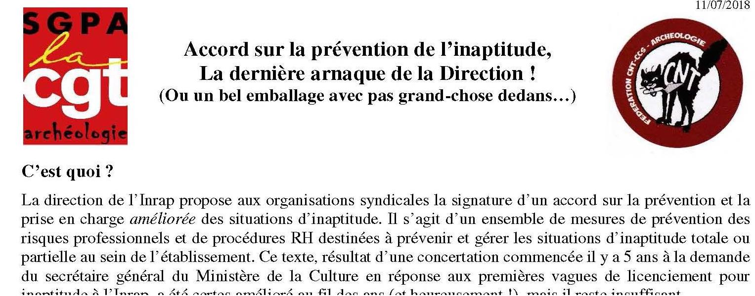 communiqué SGPA-CGT CNT-CCS sur le refus de signer le projet d’accord sur la prévention de l’inaptitude à l’Inrap