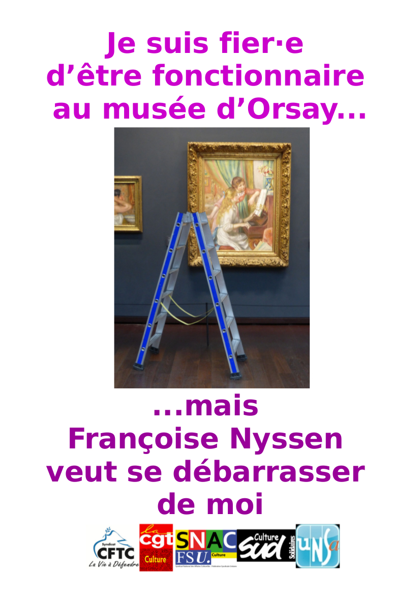 C’est pour contester ce projet de transfert de gestion, très lourd de conséquences nocives pour les personnels, et obtenir satisfaction sur des revendications connues et légitimes, que les organisations CFTC-Culture CGT-Culture, SNAC-Fsu, SUD-Culture-Solidaires et UNSA-Culture appellent les agents à cesser le travail ce mardi 2 octobre 2018, ainsi que pour les nuitées en aval et en amont de cette journée.